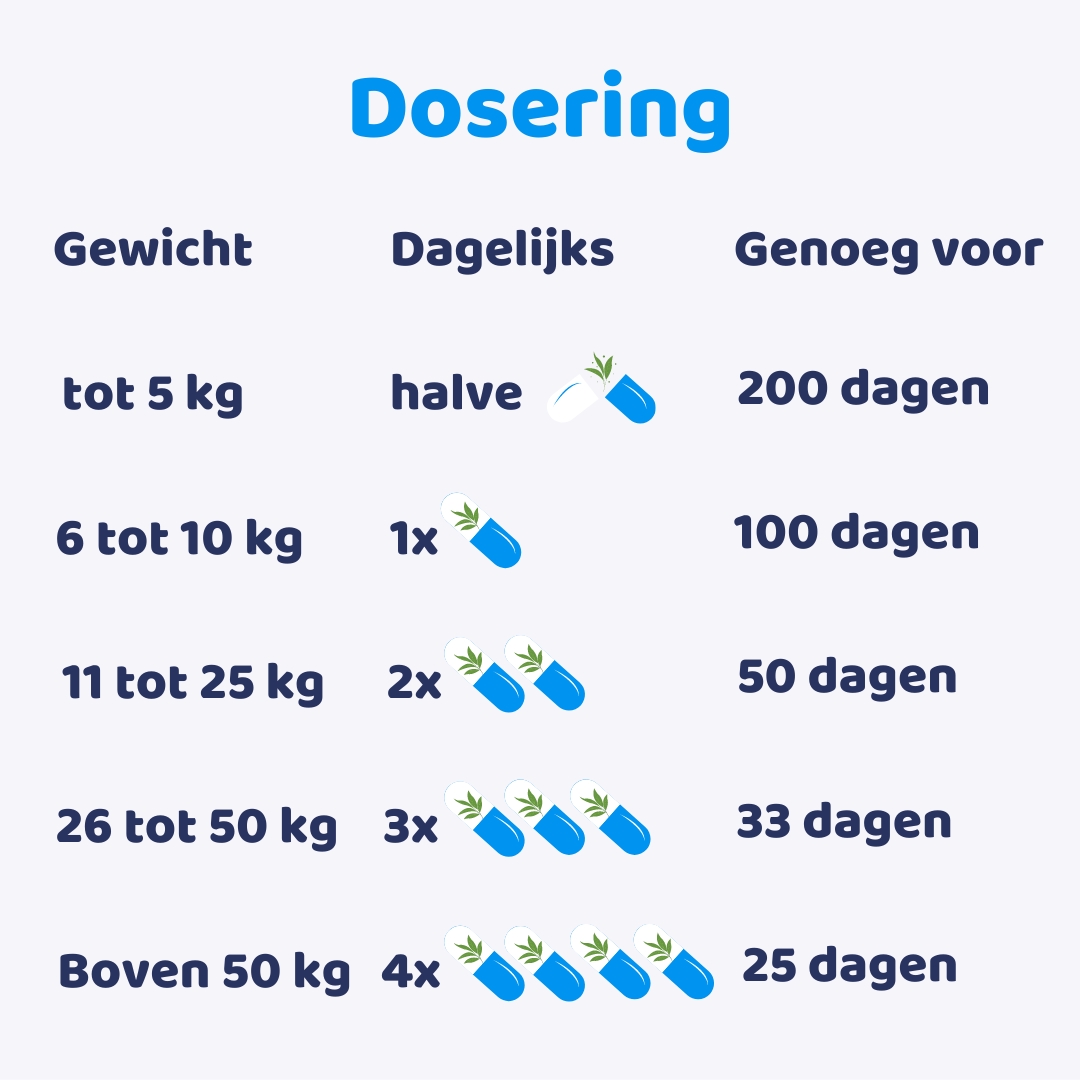 Ik gebruik deze supplementen inmiddels al een tijdje en ik ben er zeer tevreden over. Onze hond is nogal overgevoelig en reageert op alles. Ze kon daar behoorlijk in doorslaan. Deze supplementen zorgen ervoor dat ze bereikbaar blijft zodat ik haar makkelijker kan afleiden en/of gerust stellen. Het is geen wondermiddel, maar haalt net even die scherpe randjes eraf zodat ik haar beter kan begeleiden. Ze mag 3 tabletten per dag, wij geven er ‘s ochtends 1tje en ‘s middags 1tje. De 3de bewaren we voor bijvoorbeeld vuurwerk of onweer.