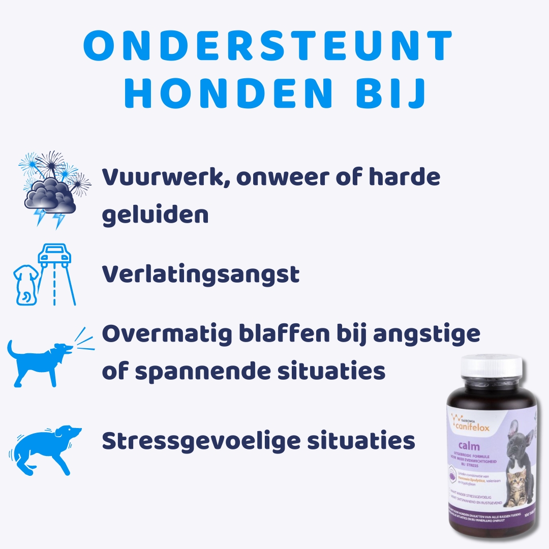 Veel honden ervaren spanning in het dagelijks leven, of dat nu komt door alleen thuis zijn, veranderingen of harde geluiden zoals vuurwerk. Canifelox Calm helpt je hond ontspannen op een volledig natuurlijke manier, zonder te drogeren, suf te maken of energie weg te nemen. Je hond blijft dus helemaal zichzelf.